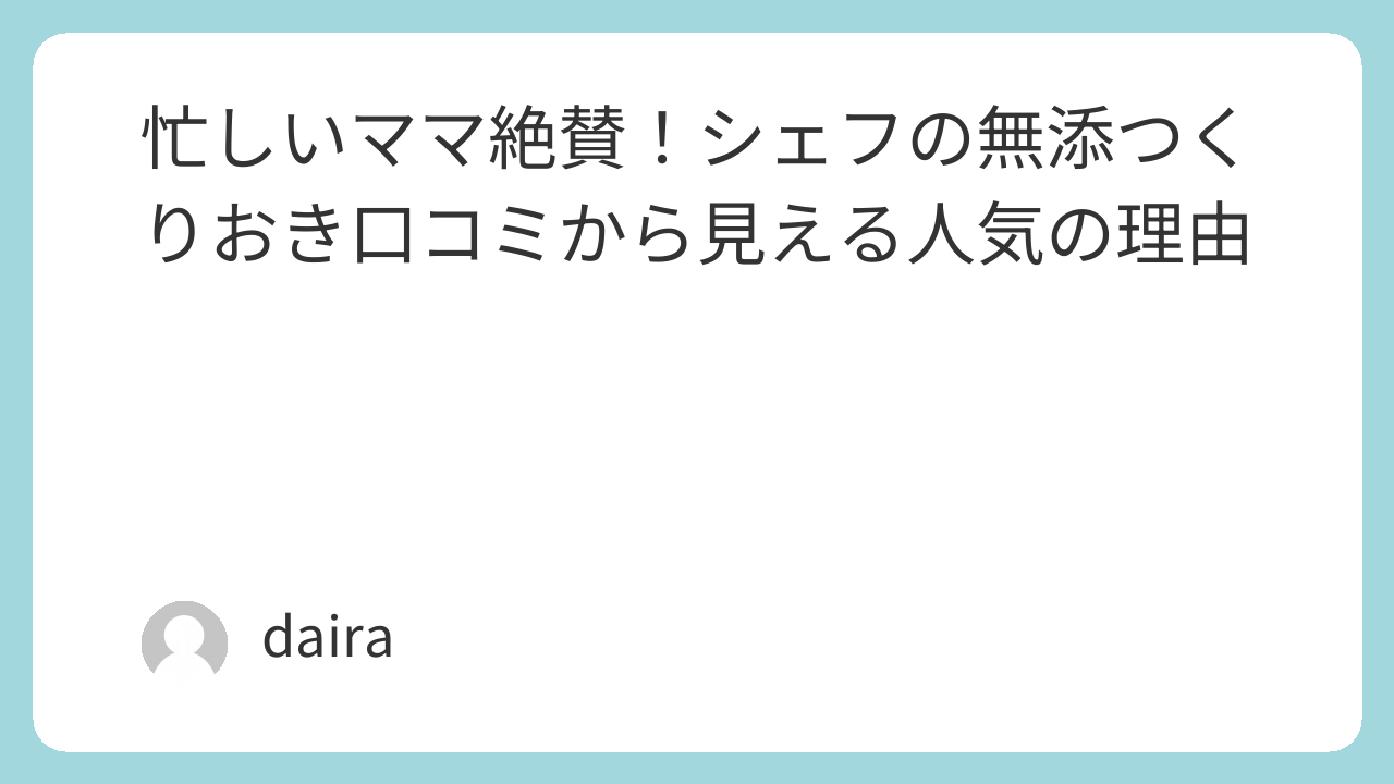 このように、シェフの無添つくりおきは「共働き家庭」「子育て世帯」「時短したい人」に特にフィットするサービスです。口コミを見ても、**“毎日使う”より“忙しい週を救う存在”**としての活用が多いのが特徴です。